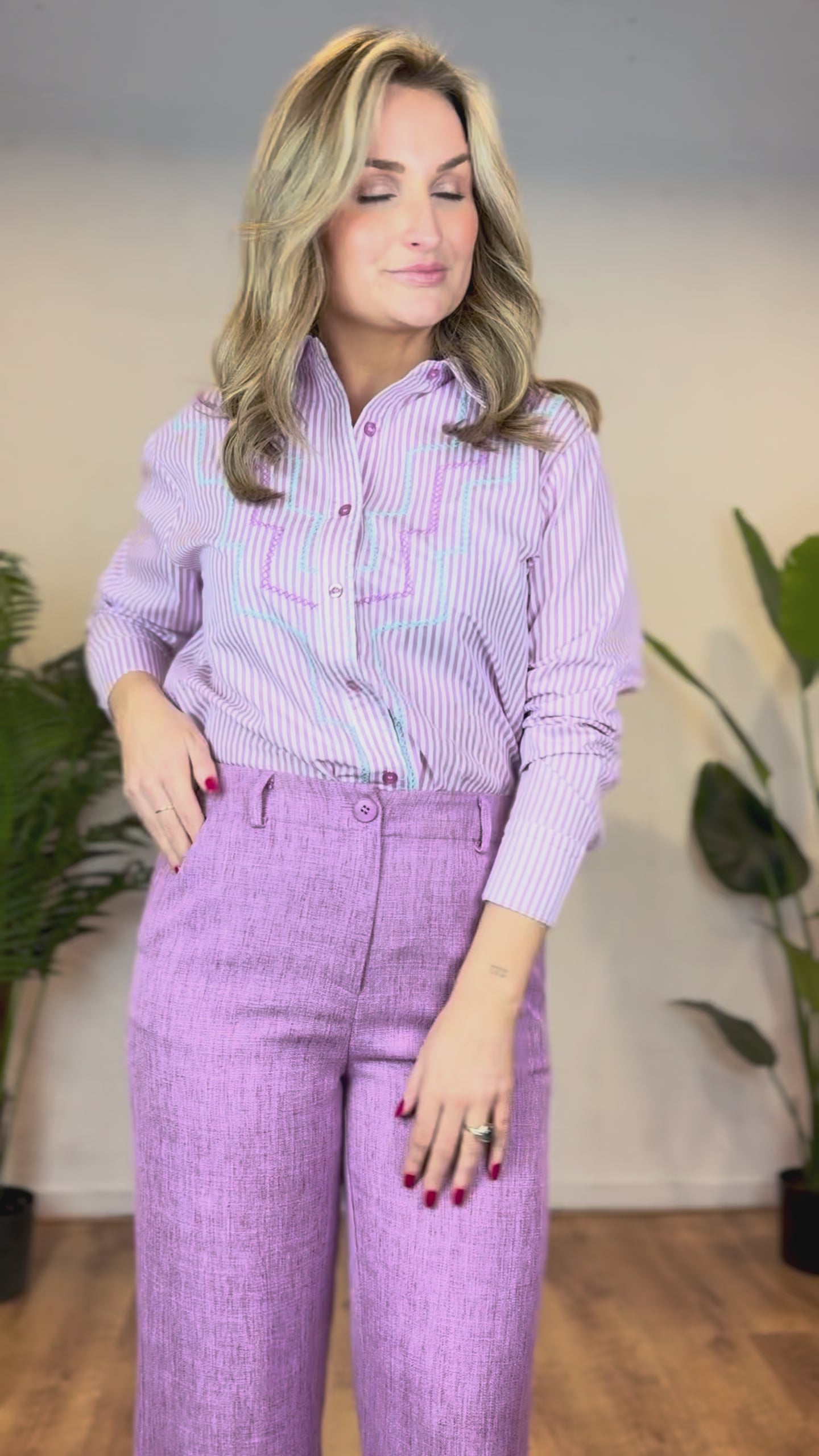 De Blouse Gaby van Ydence is een echte eyecatcher dankzij de frisse violet strepen en het verfijnde borduurdetail op de voorzijde. De klassieke kraag en doorknoopsluiting geven de blouse een tijdloze uitstraling, terwijl de subtiele turquoise accenten zorgen voor een speelse twist.