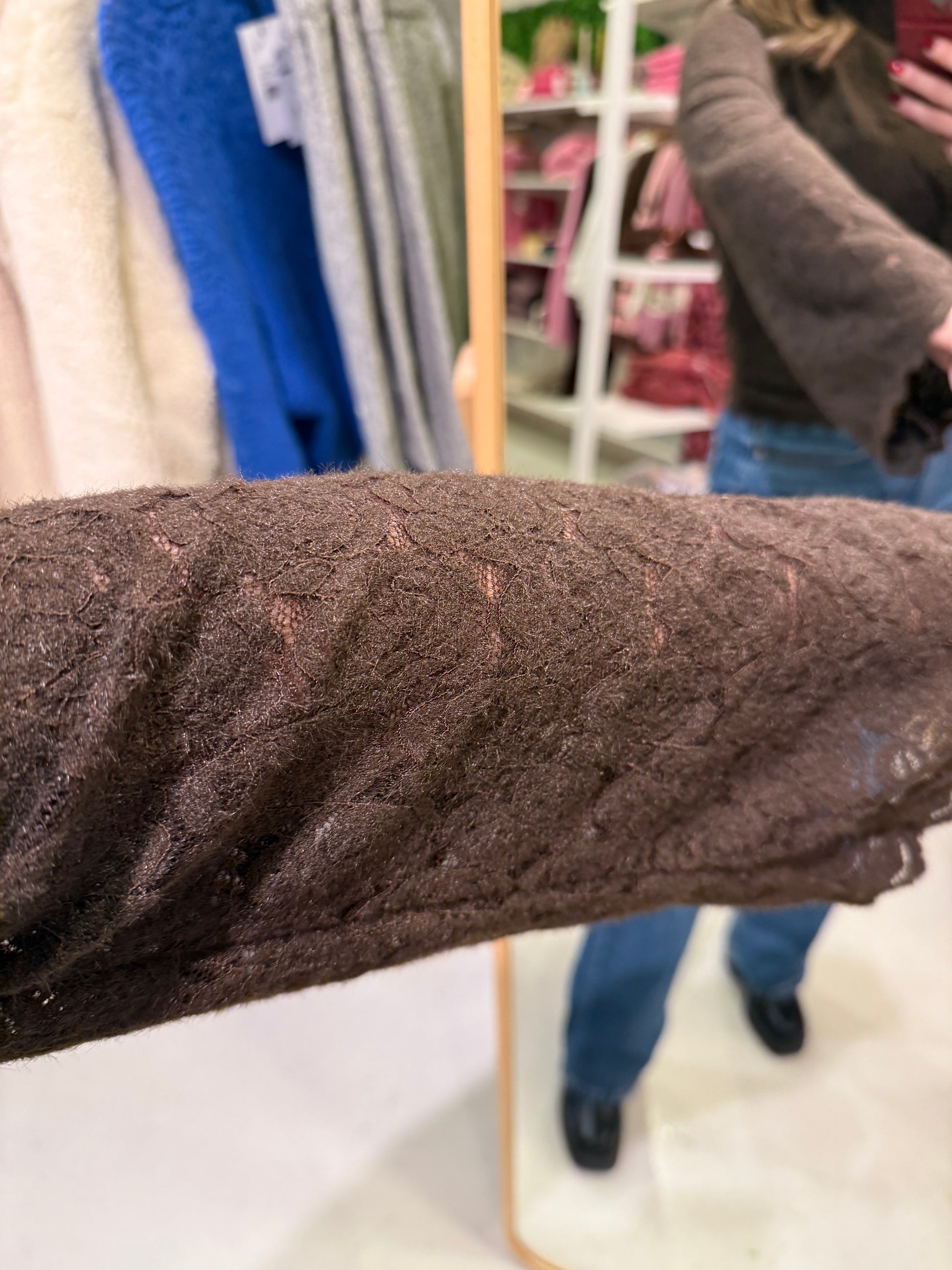 Deze bruine kanten top is een elegante en vrouwelijke musthave die elke outfit direct een luxe uitstraling geeft. De fijne col, het delicate kantpatroon en de licht doorschijnende mouwen zorgen voor een stijlvolle en moderne look. Dankzij de zachte stretch voelt de top comfortabel en flatterend aan.