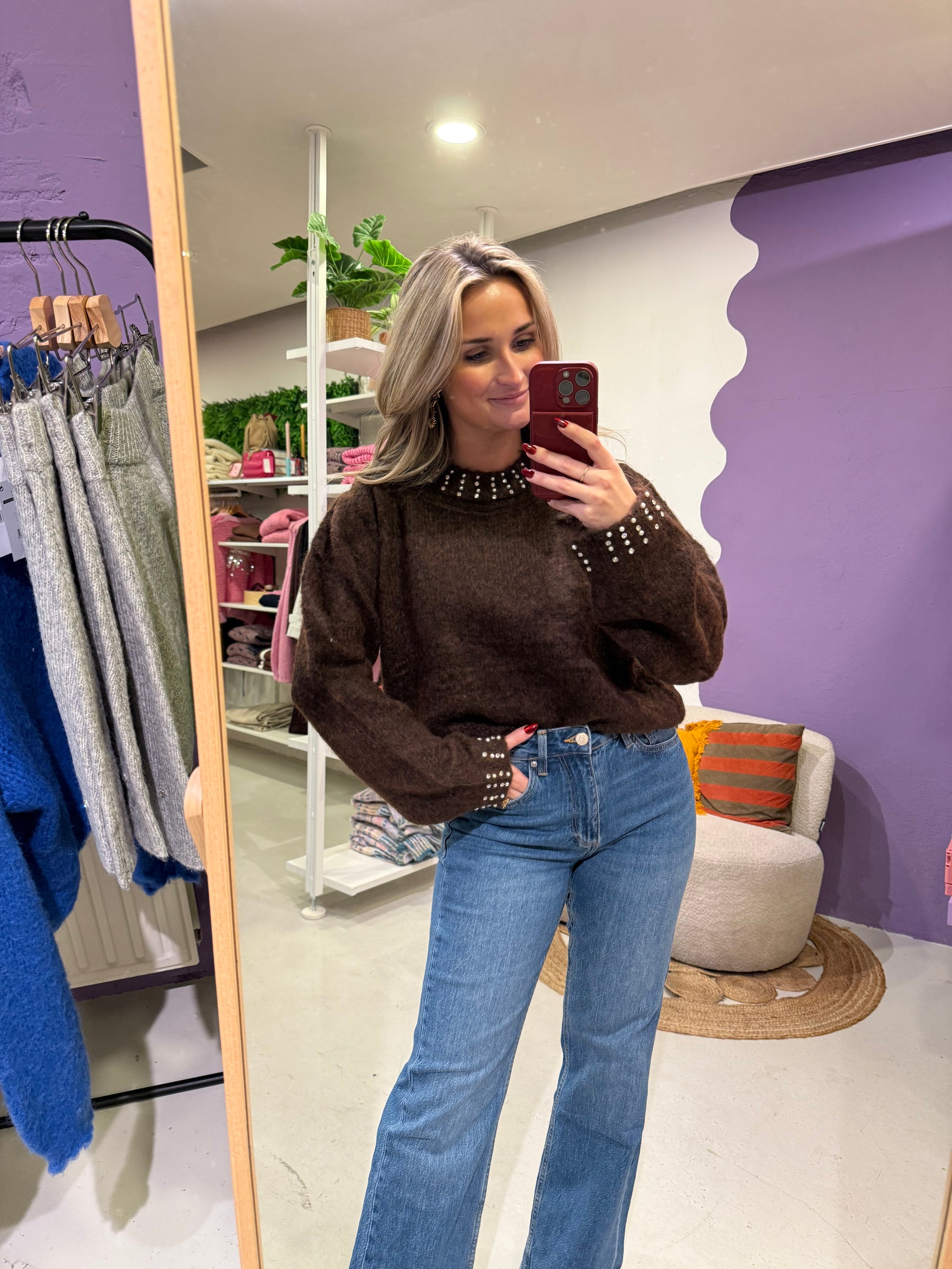 Geef je wintergarderobe een elegante upgrade met deze luxueuze chocoladebruine knit. De trui is gemaakt van een zachte, fluffy kwaliteit die comfortabel aanvoelt én direct een stijlvolle uitstraling geeft. De subtiele pareldetails langs de halslijn en manchetten zorgen voor een chique, vrouwelijke touch — precies dat beetje extra dat je outfit compleet maakt.
