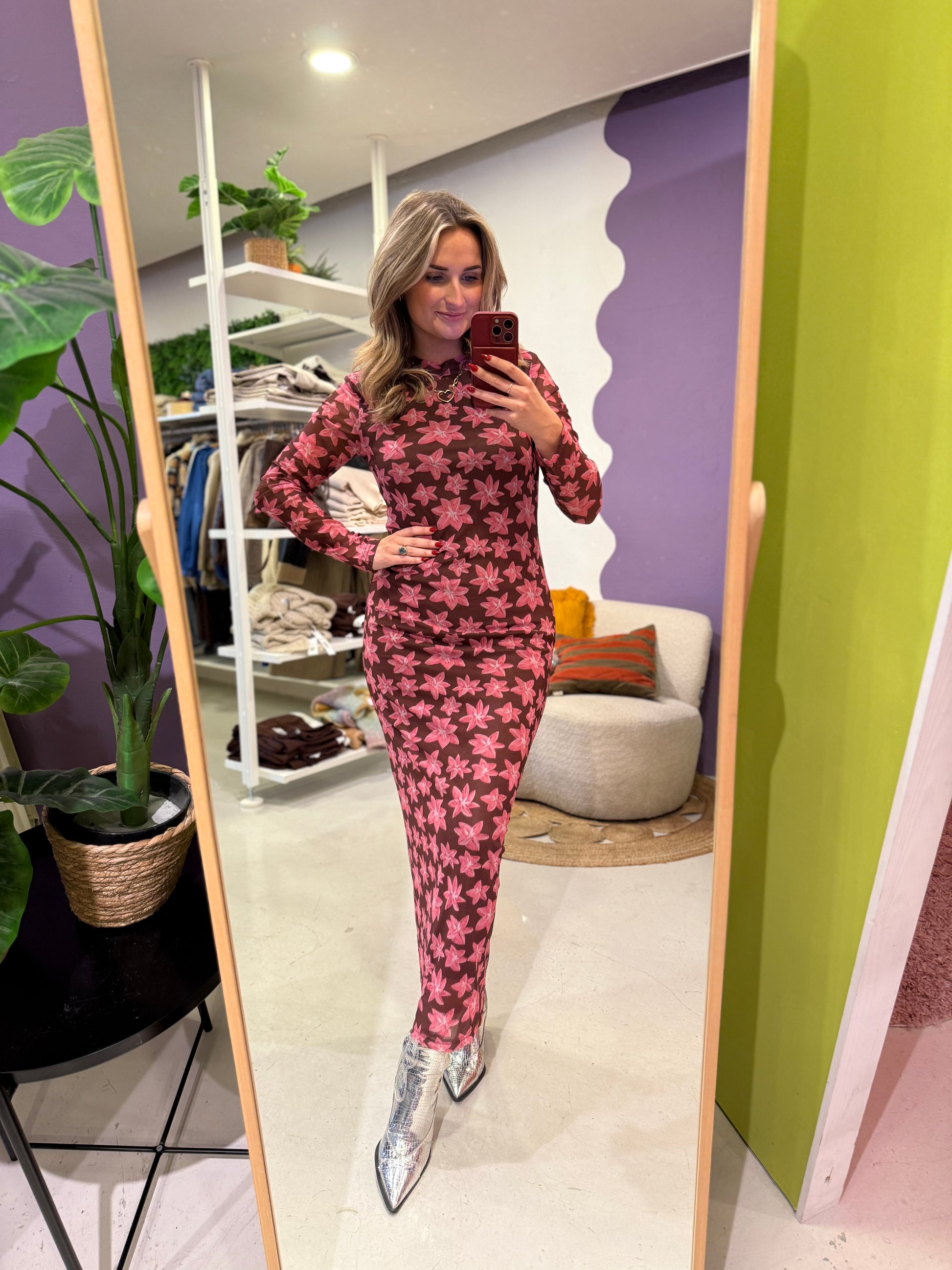 De Dress Lauren van Ydence is een prachtige lange jurk van mesh met lange mouwen en een gevoerde binnenkant voor extra comfort. De jurk heeft een bruine basis met roze bloemenprint, wat zorgt voor een vrouwelijke en elegante uitstraling. Perfect voor een diner, feestje of een stijlvolle daglook!