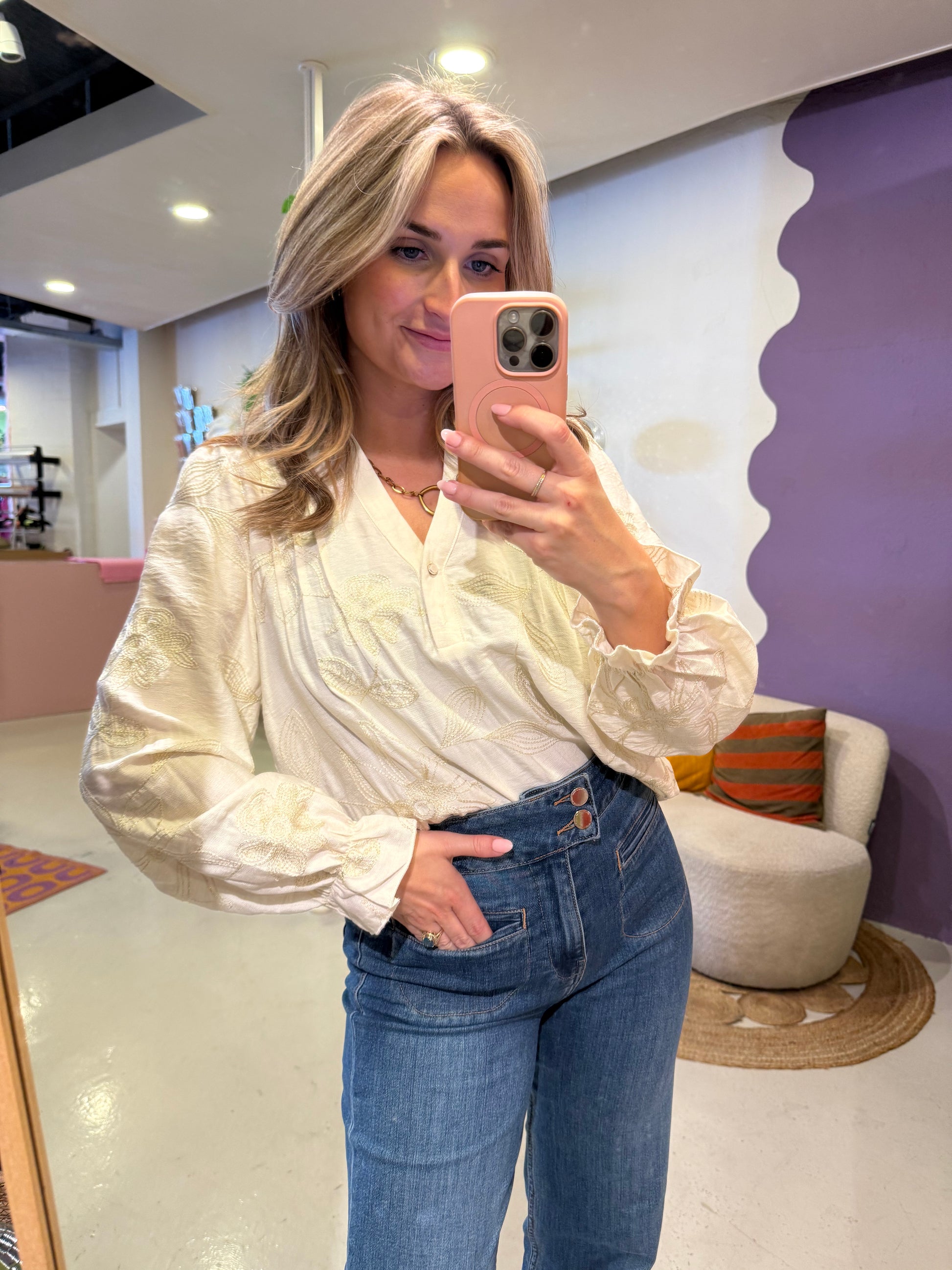 Ecru blouse met ruffle kraag en glitter bloemen print