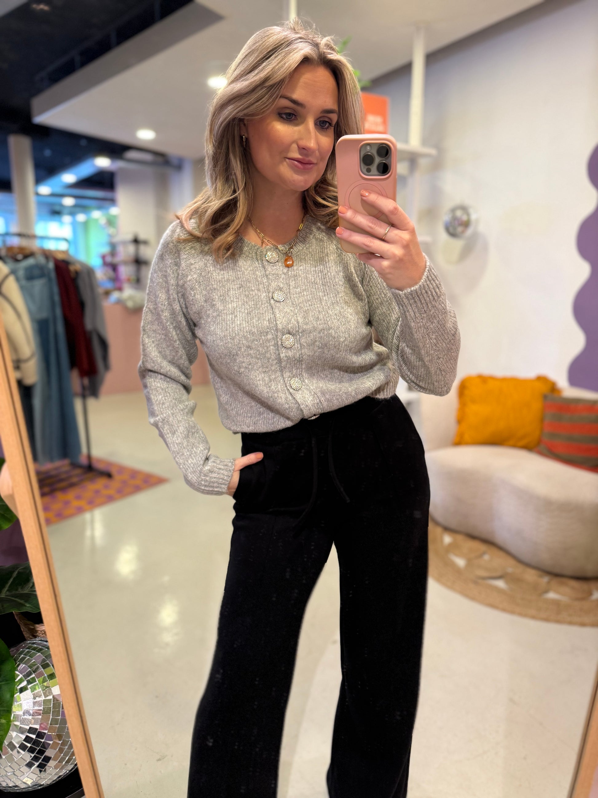 Deze elegante cardigan is een echte must-have voor je garderobe. Het verfijnde breisel met subtiel patroon geeft een luxe uitstraling, terwijl de zes knopen aan de voorkant, bezet met decoratieve steentjes, een vrouwelijke en chique touch toevoegen. De ronde hals maakt het vest tijdloos en veelzijdig – perfect te combineren met zowel casual als geklede outfits.