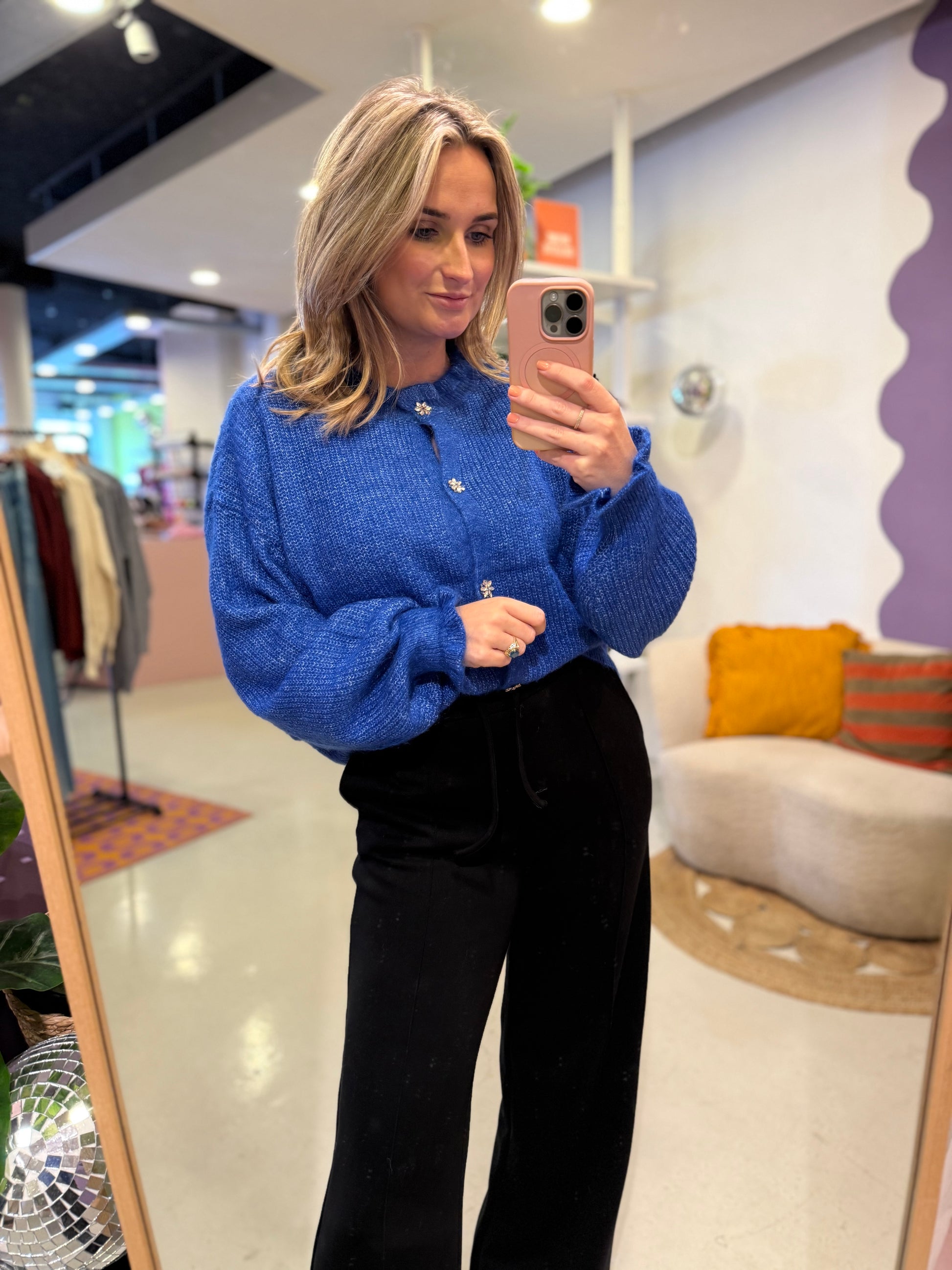 Dit vestje in een opvallende cobalt blauwe kleur is een echte eyecatcher. De glitter knoopjes geven een speelse sparkle, terwijl de subtiele ruffle details aan de mouwen zorgen voor een vrouwelijke touch. Perfect om zowel casual als feestelijk te stylen!