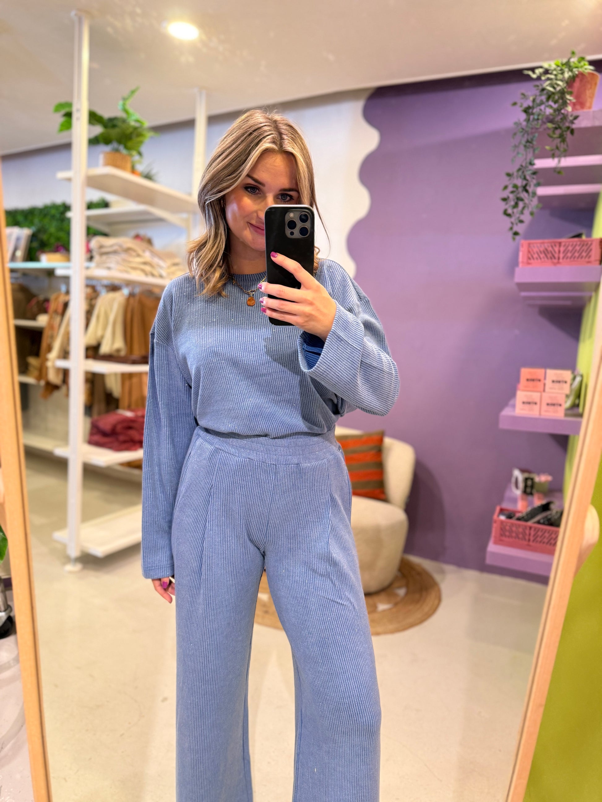 De Raynelle pants van Fluresk is de perfecte match bij de gelijknamige sweater. De broek is uitgevoerd in een blauwe kleur met een comfortabele elastische tailleband en heeft een wijde pijp voor een moderne, relaxte look.