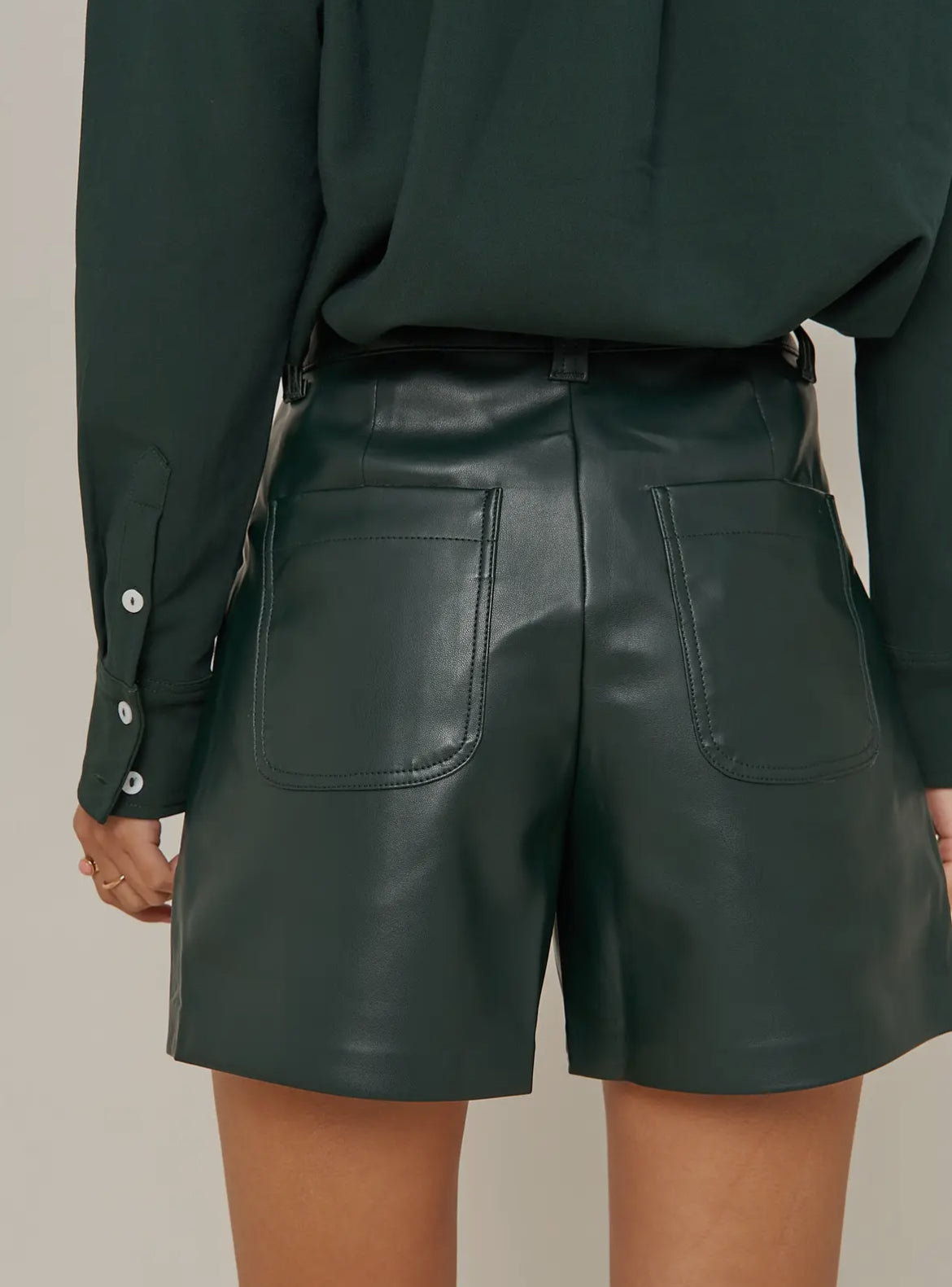 Groene short met hoge taille. De short heeft zakjes en een rits met knoopsluiting. De pijpjes zijn wat langer.