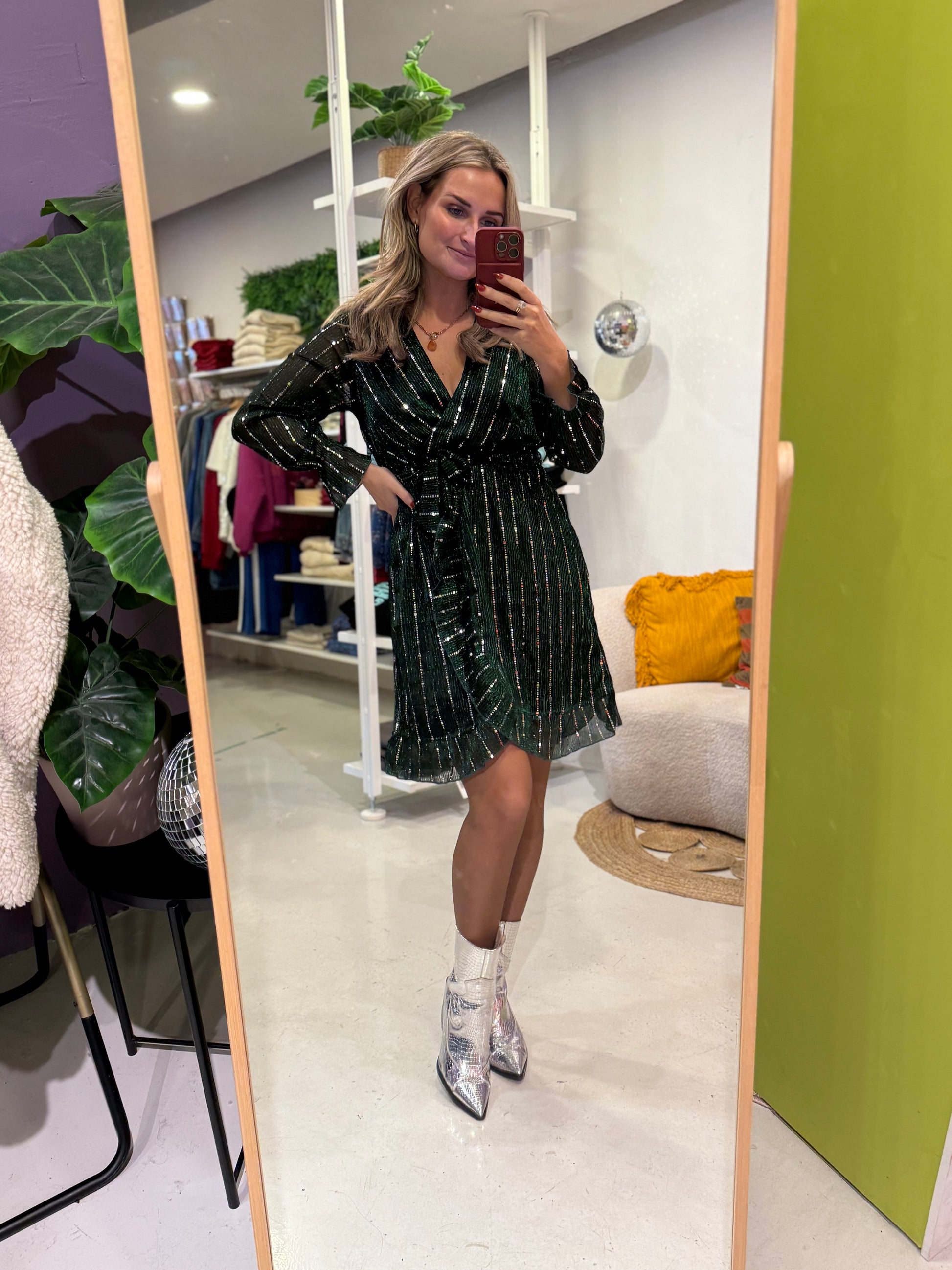 Deze feestelijke wikkeljurk is volledig bezet met subtiele glinsterende streepjes die prachtig meebewegen bij elke stap die je zet. De jurk heeft een vrouwelijke V-hals, transparante mouwen en een elegante tailleband die je figuur mooi accentueert. De luchtige stof valt soepel en geeft de jurk een speelse, maar toch luxe uitstraling.