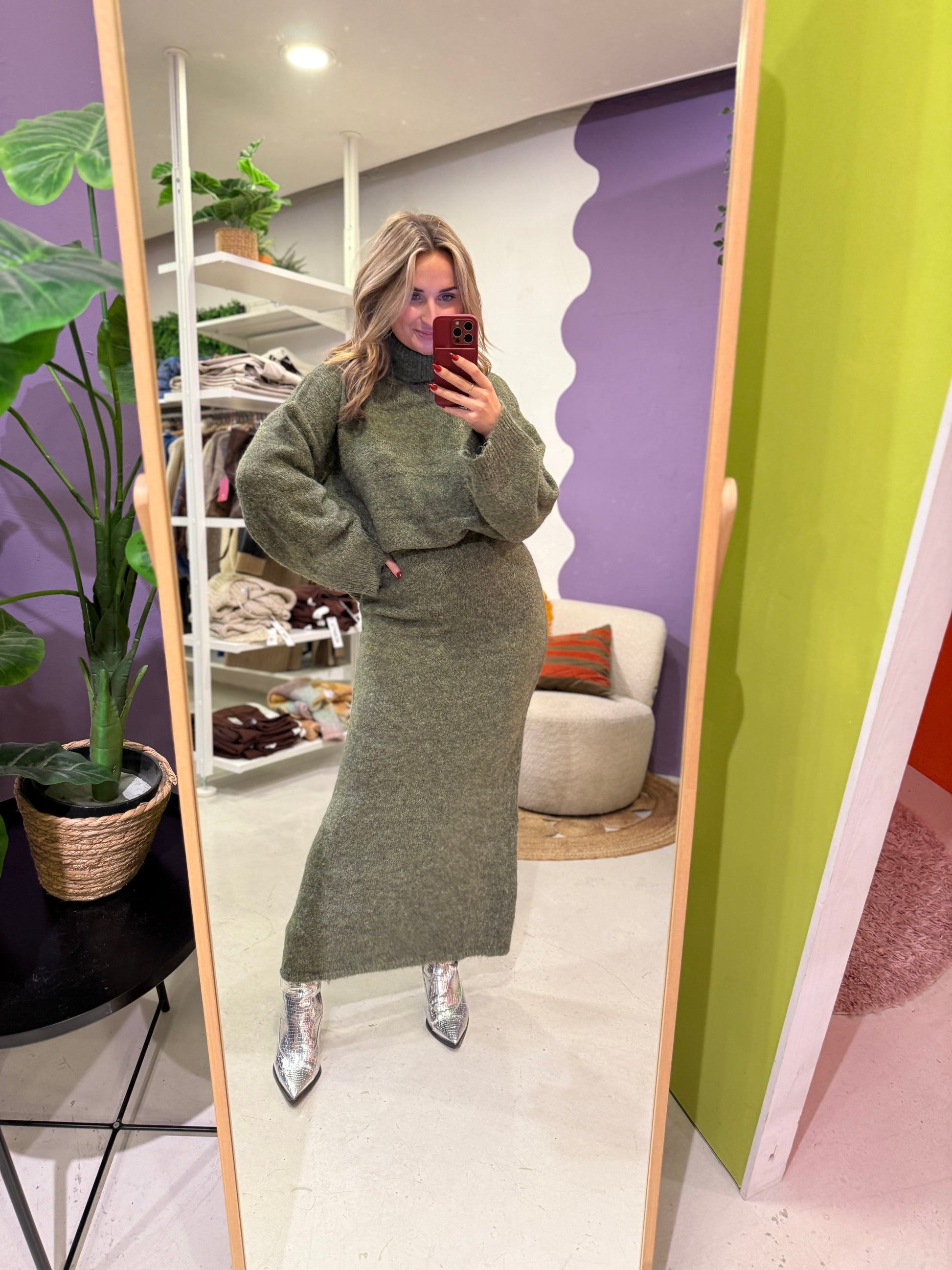 Combineer de Eveline rok met de bijpassende gebreide trui voor een cozy en stijlvolle set waarmee je moeiteloos chic voor de dag komt. Draag hem met sneakers voor een casual look of met laarsjes voor een meer geklede uitstraling.