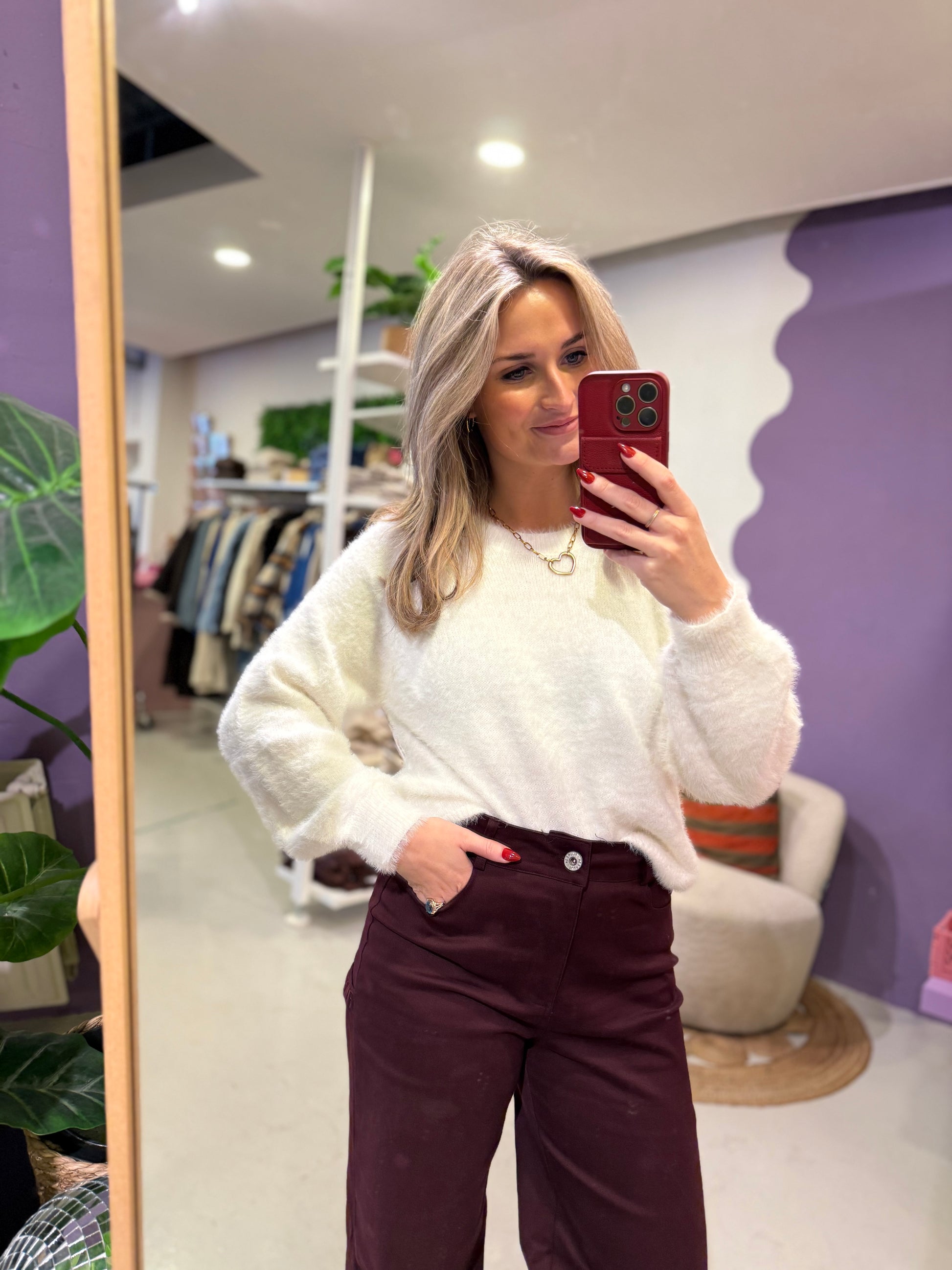 Deze fluffy trui is de ultieme combinatie van comfort en stijl. De superzachte stof voelt heerlijk aan op de huid en geeft een luxe, cozy uitstraling. De trui heeft een ronde halslijn en lange mouwen, perfect voor koude dagen waarop je er toch stijlvol uit wilt zien.