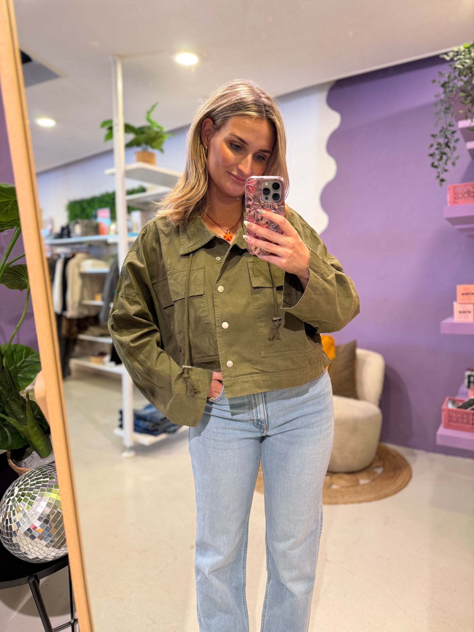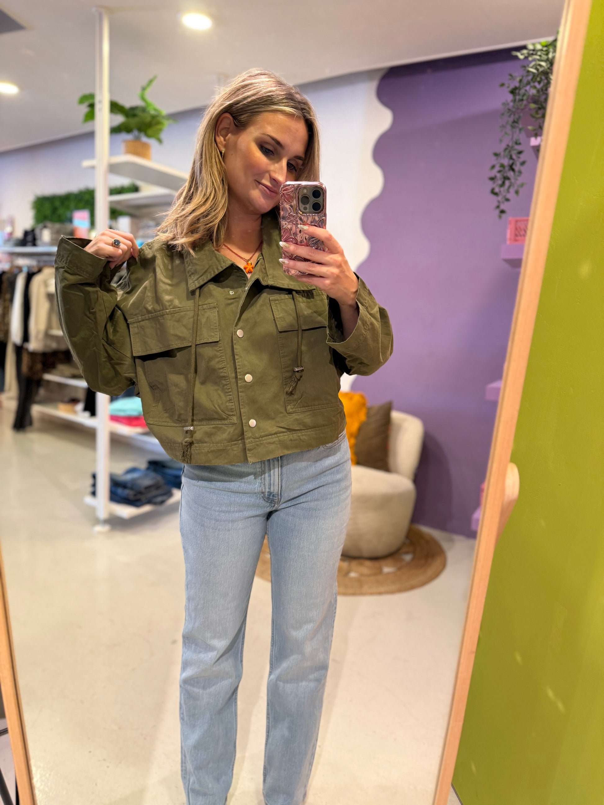 Kort jasje legergroen. 100% katoen