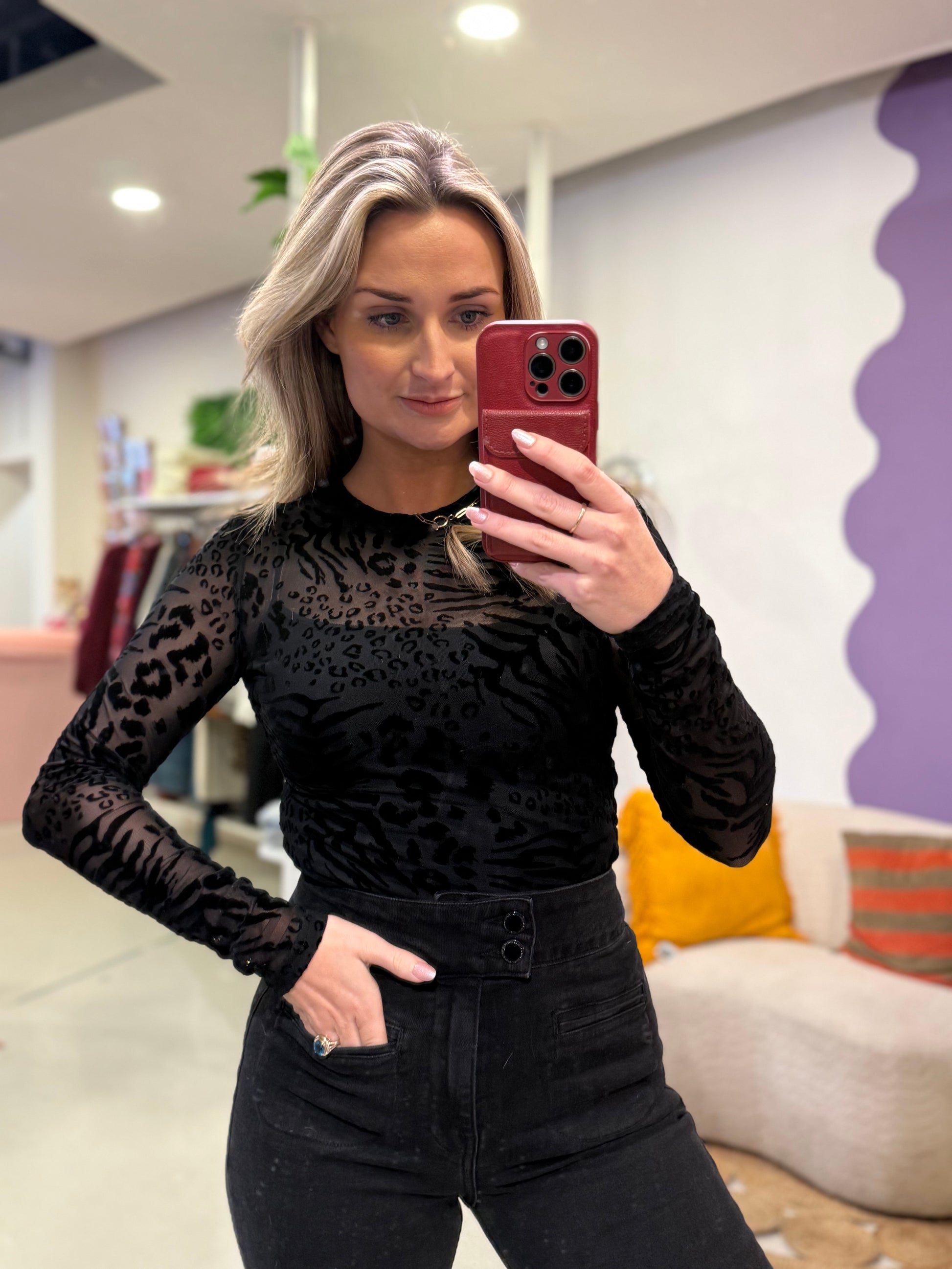 Deze prachtige body is gemaakt van een luchtige mesh stof met een tijgerprint in zachte flock, waardoor de print niet alleen opvalt, maar ook een luxe, fluweelachtige touch heeft. De stofmix van 90% polyester, 5% viscose en 5% elastan zorgt voor een comfortabele stretch en een mooie, aansluitende pasvorm.