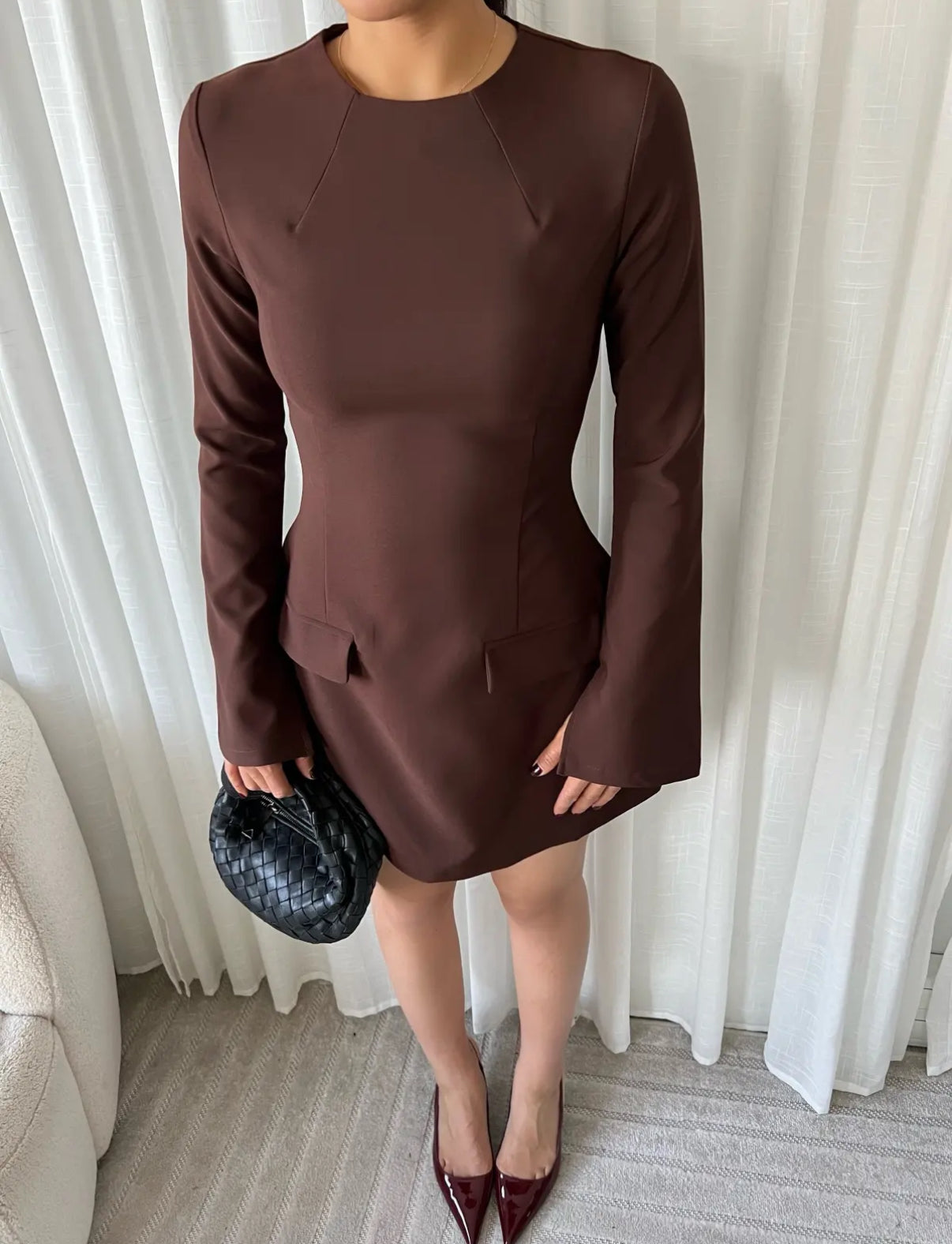 De jurk heeft lange, licht uitlopende mouwen, wat het geheel een moderne en speelse twist geeft. Aan de voorkant vind je twee sier zakjes die de jurk een subtiele, designer-achtige look geven. De mini-lengte maakt de jurk vrouwelijk en elegant, zonder overdreven te zijn.