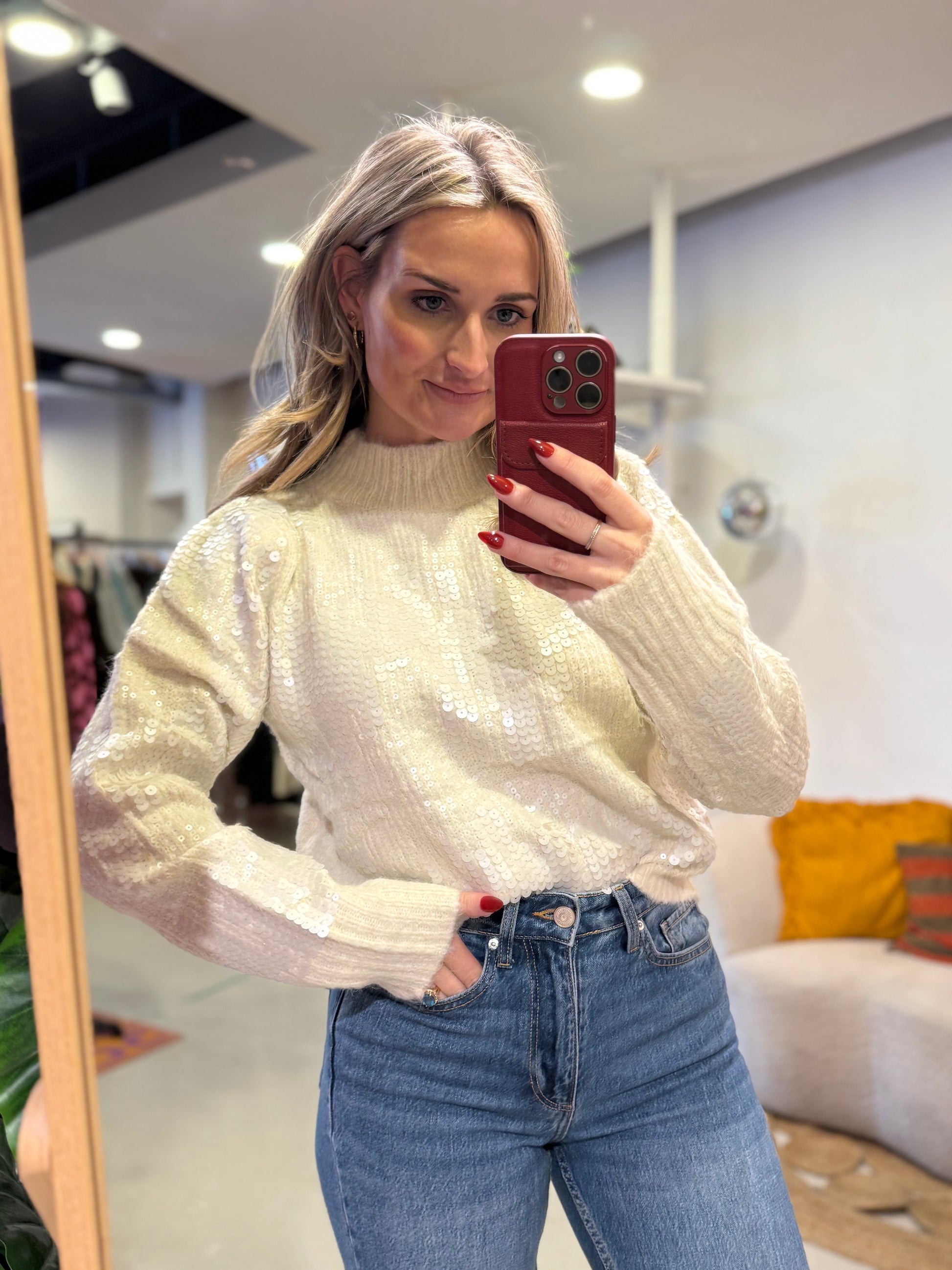 Deze ecru trui met pailletten brengt warmte en sparkle perfect samen! De ronde hals en lichte pofmouwen geven een vrouwelijke touch, terwijl de subtiele glans van de pailletten zorgt voor een feestelijke look. Ideaal om je dagelijkse outfit net dat beetje extra te geven!