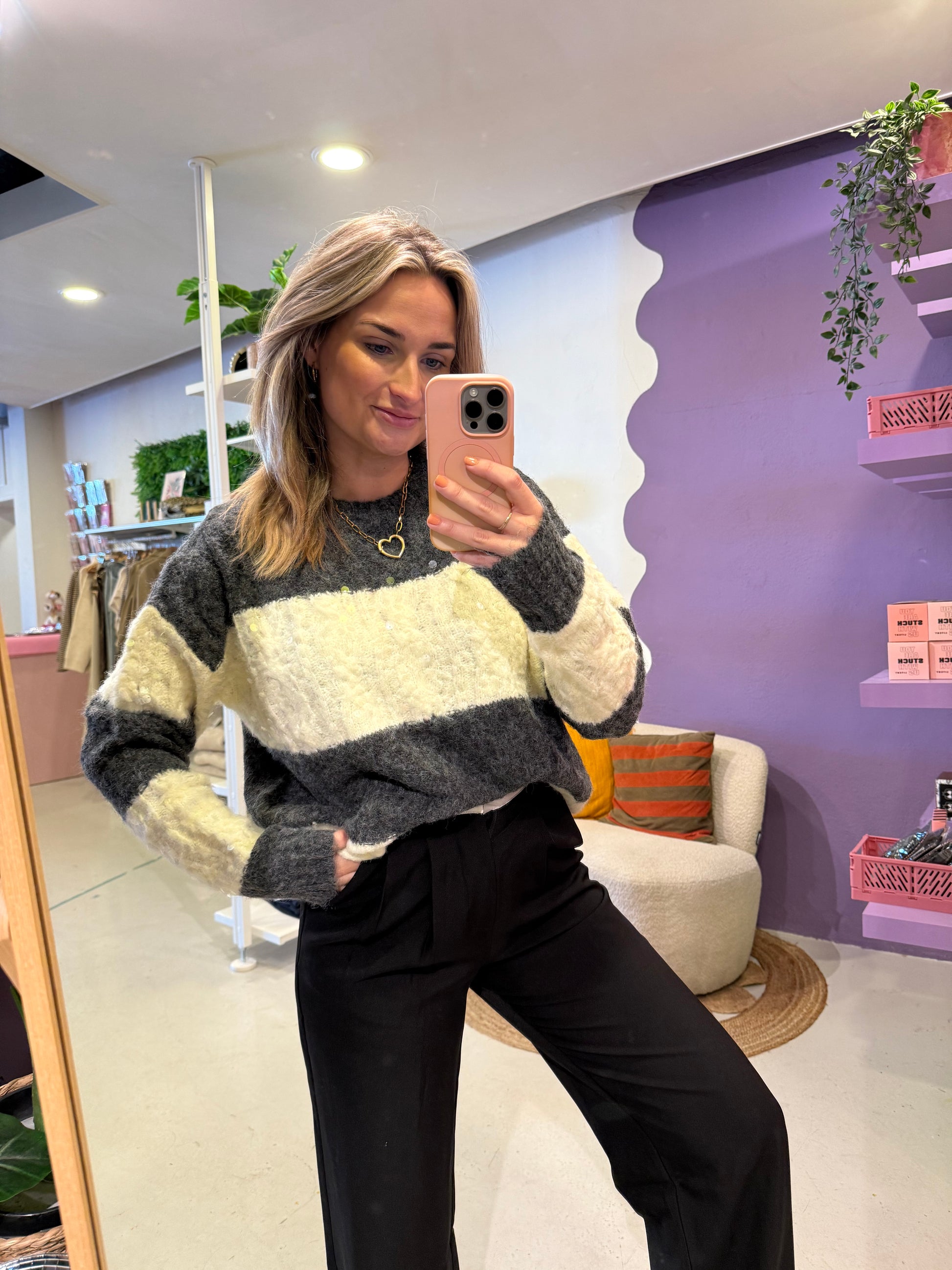 De Selera trui van Fluresk is een echte eyecatcher voor het najaar en de winter. Deze grofgebreide, superzachte trui combineert comfort met een vleugje glamour. De brede strepen in zachtgrijs en vanille geven een tijdloze uitstraling, terwijl de subtiel glinsterende pailletten op de vanillekleur zorgen voor een speels en feestelijk effect.