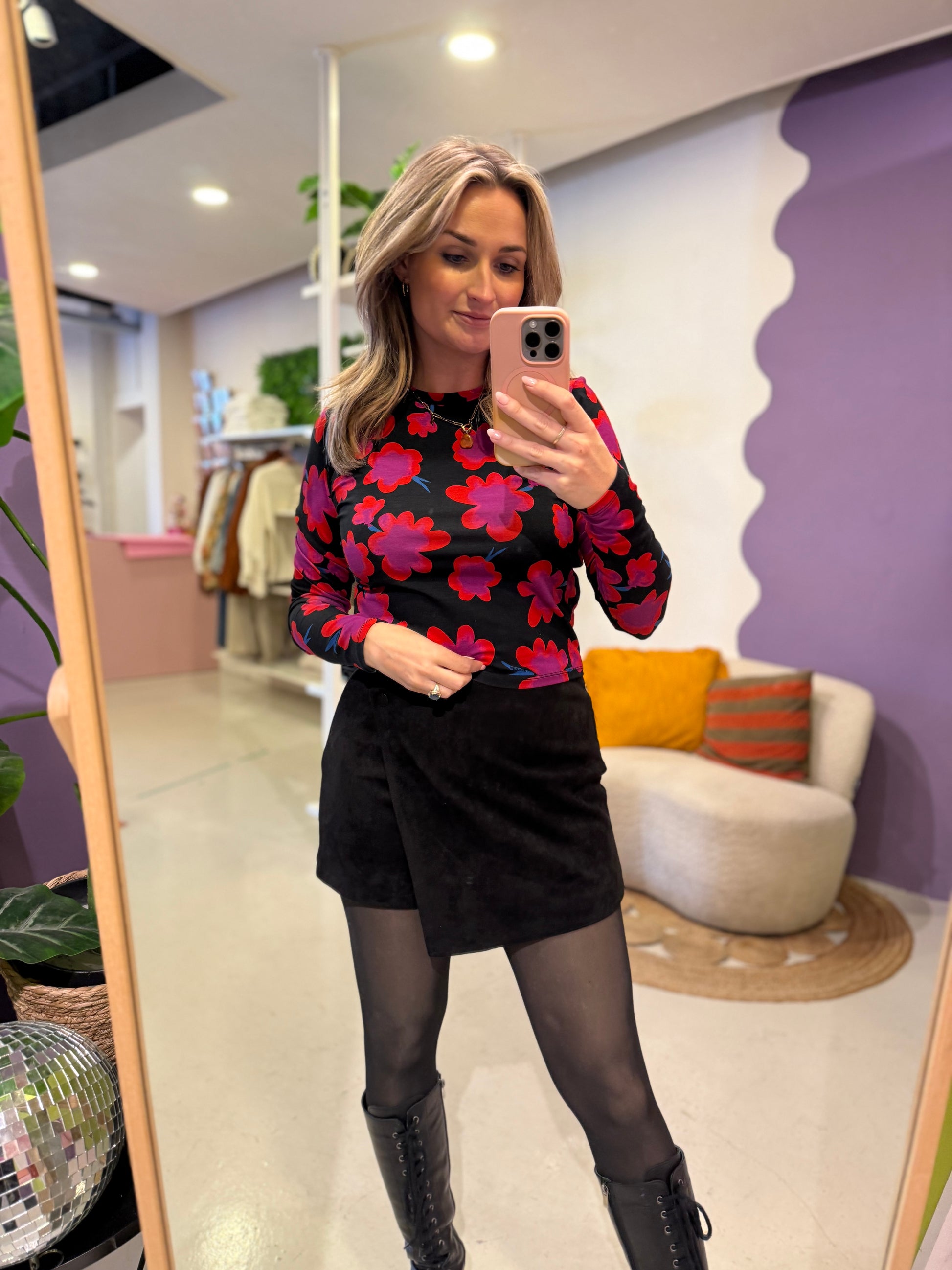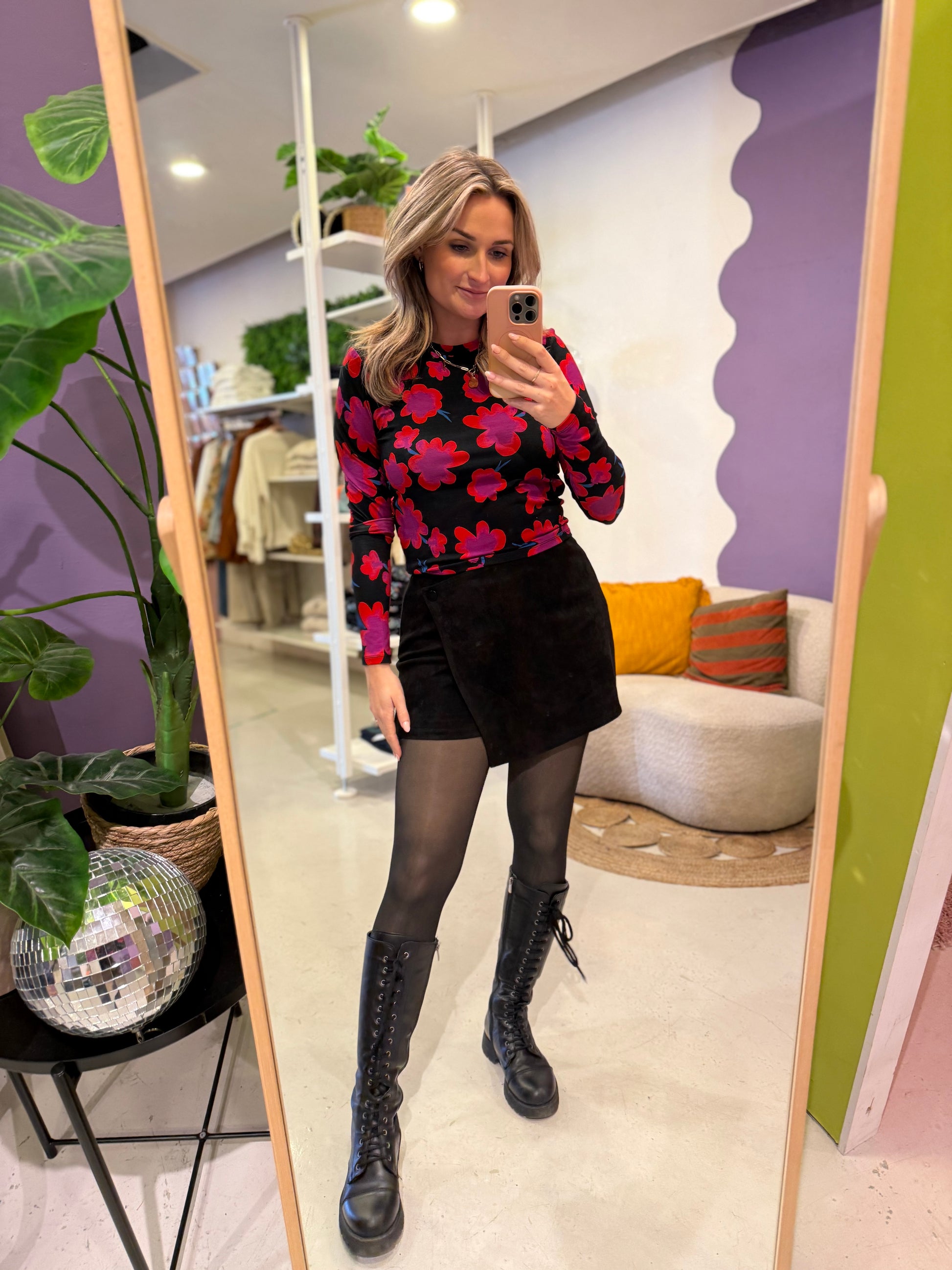 Stijlvol en veelzijdig: deze skort combineert het vrouwelijke van een rok met het comfort van een short. Gemaakt van zachte suede-look stof, voelt hij luxe aan en draagt hij heerlijk soepel. De overslag met knoopdetail aan de voorkant geeft een speelse twist, terwijl de blinde rits aan de zijkant zorgt voor een nette en elegante afwerking.
