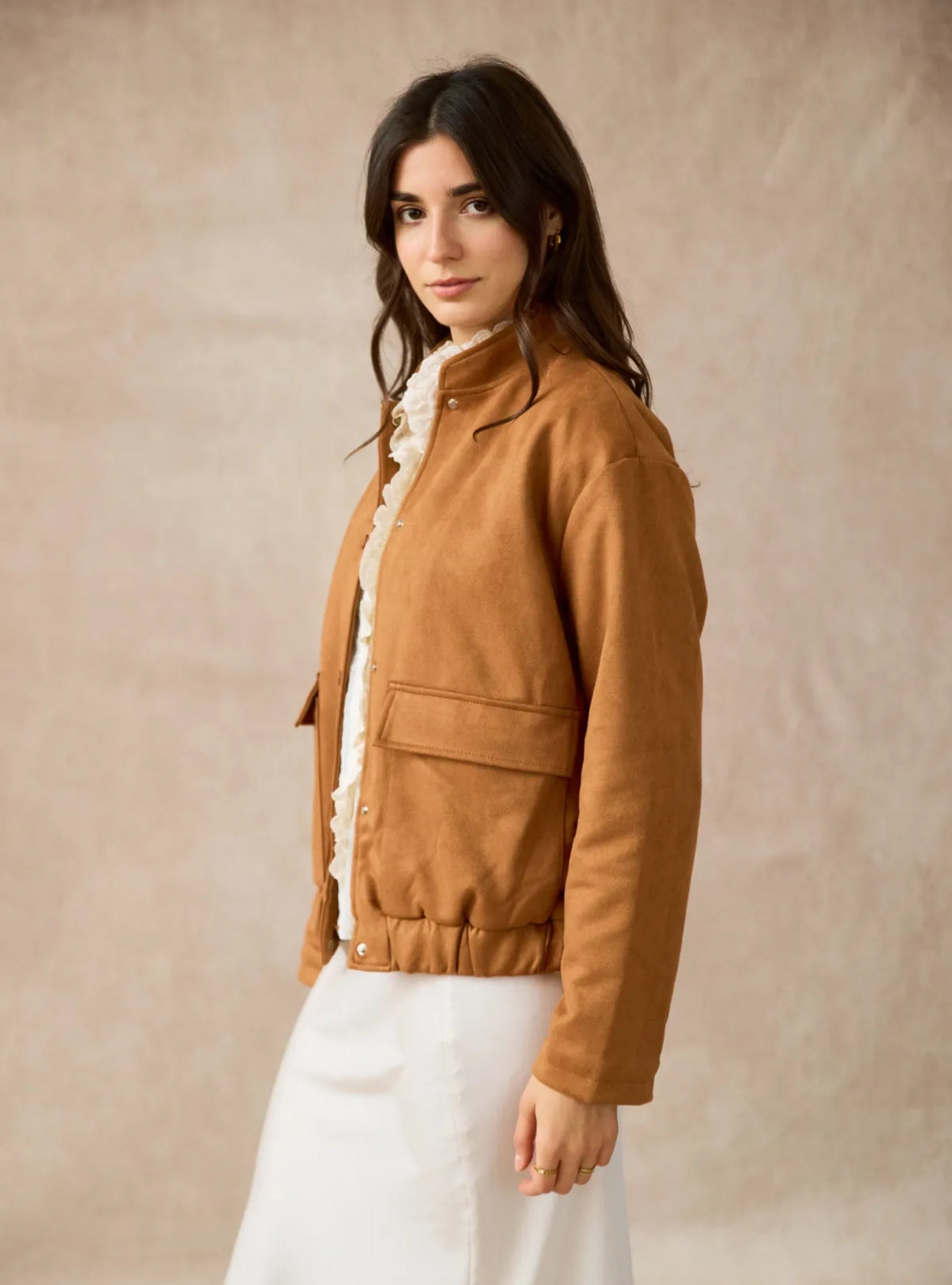 Op zoek naar hét jasje van dit moment? Dit camelbruine suedine bomber jasje is dé trend die niet mag ontbreken in jouw garderobe. Het jasje heeft de stoere uitstraling van een bomber gecombineerd met de zachte, luxe look van suedine. Dankzij de neutrale camel kleur is het eindeloos te combineren – van een casual jeans met sneakers tot een stijlvolle rok met laarsjes.