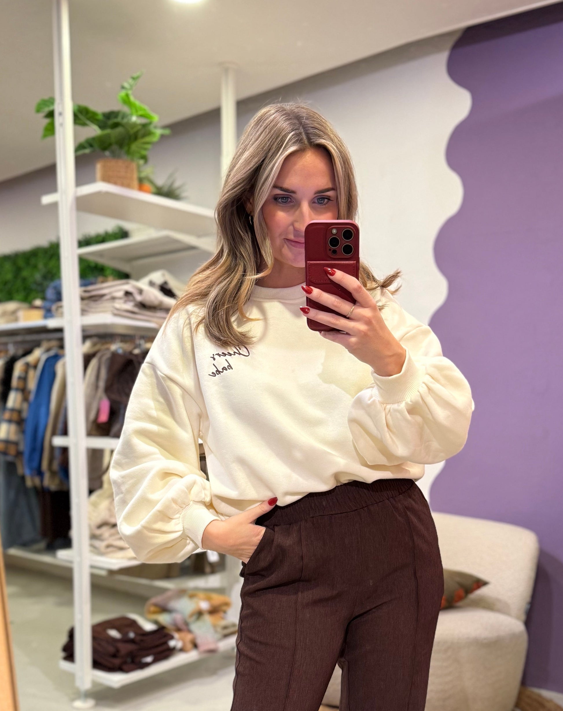 De Cheers Babe Sweater is een echte musthave! Deze witte sweater heeft een relaxte pasvorm en is gemaakt van dezelfde heerlijke, zachte stofkwaliteit (50% katoen, 50% elastan) als onze andere favorieten. De subtiele opdruk geeft ‘m een speelse, vrolijke touch — perfect om te combineren met je favoriete jeans, rok of comfy pants.