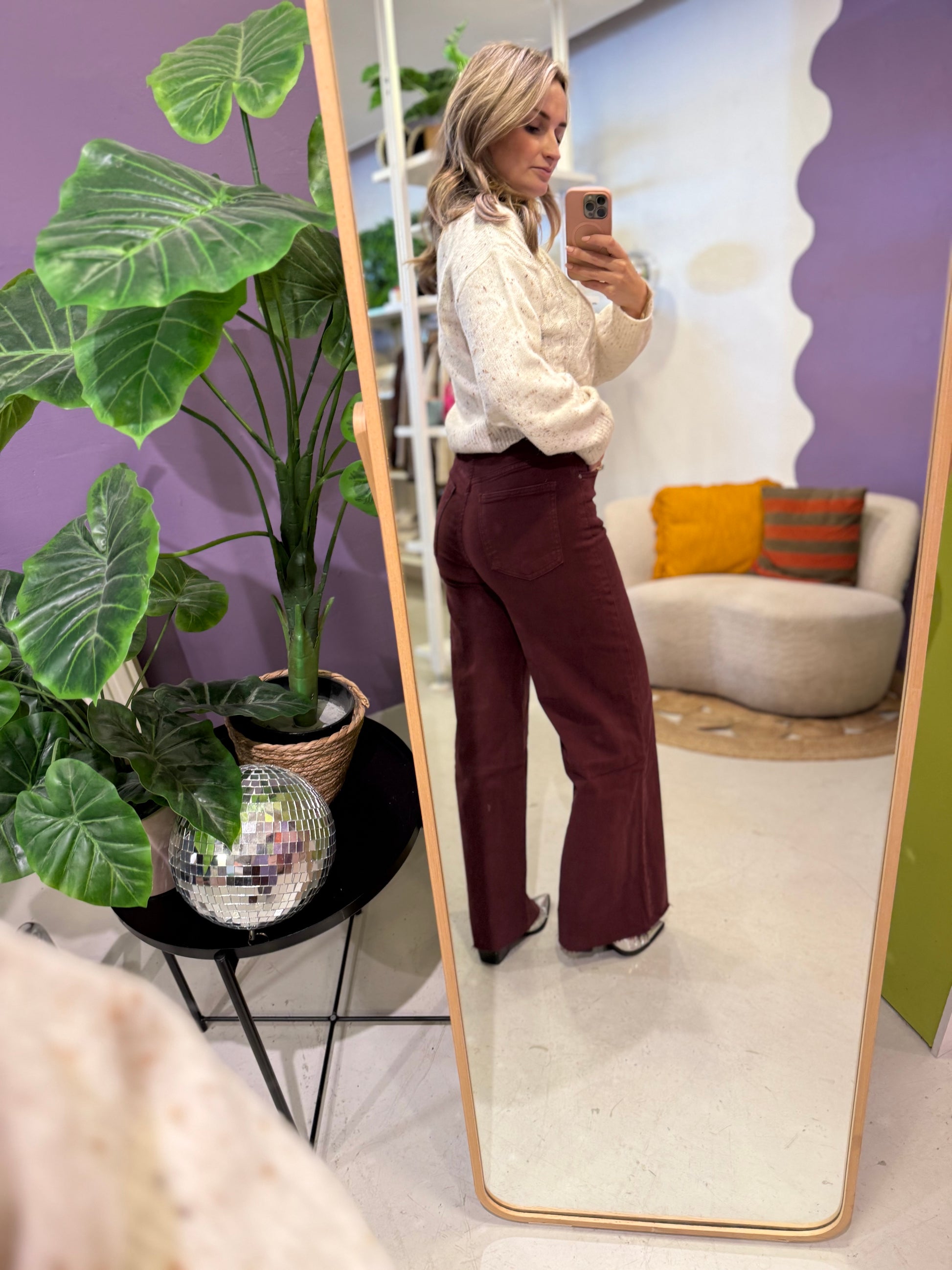 Deze bordeauxrode jeans is een echte eyecatcher en combineert comfort met stijl. De broek heeft een high waist pasvorm die het figuur mooi accentueert en zorgt voor een flatterend silhouet. De wijde pijpen geven een moderne, trendy uitstraling en maken de jeans makkelijk te stylen – zowel casual als chic.