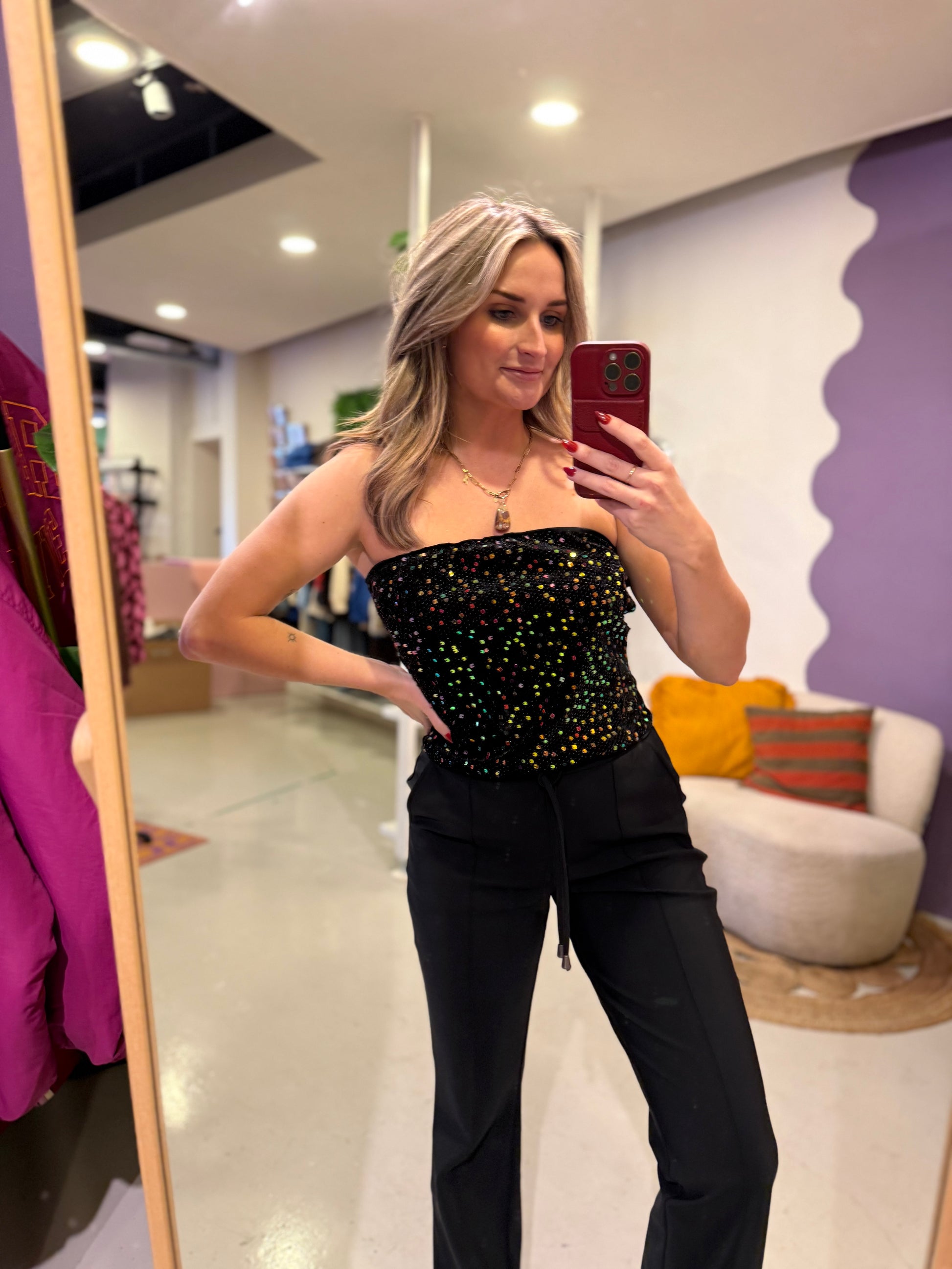 De Yindra Top van Fluresk is een echte eyecatcher! Deze korte tube top is bezaaid met glitterende pailletten op een zachte velvet voorkant – perfect voor een feestelijke look met een luxe touch. De stretch op de rug zorgt voor een comfortabele pasvorm die mooi aansluit op je lichaam.