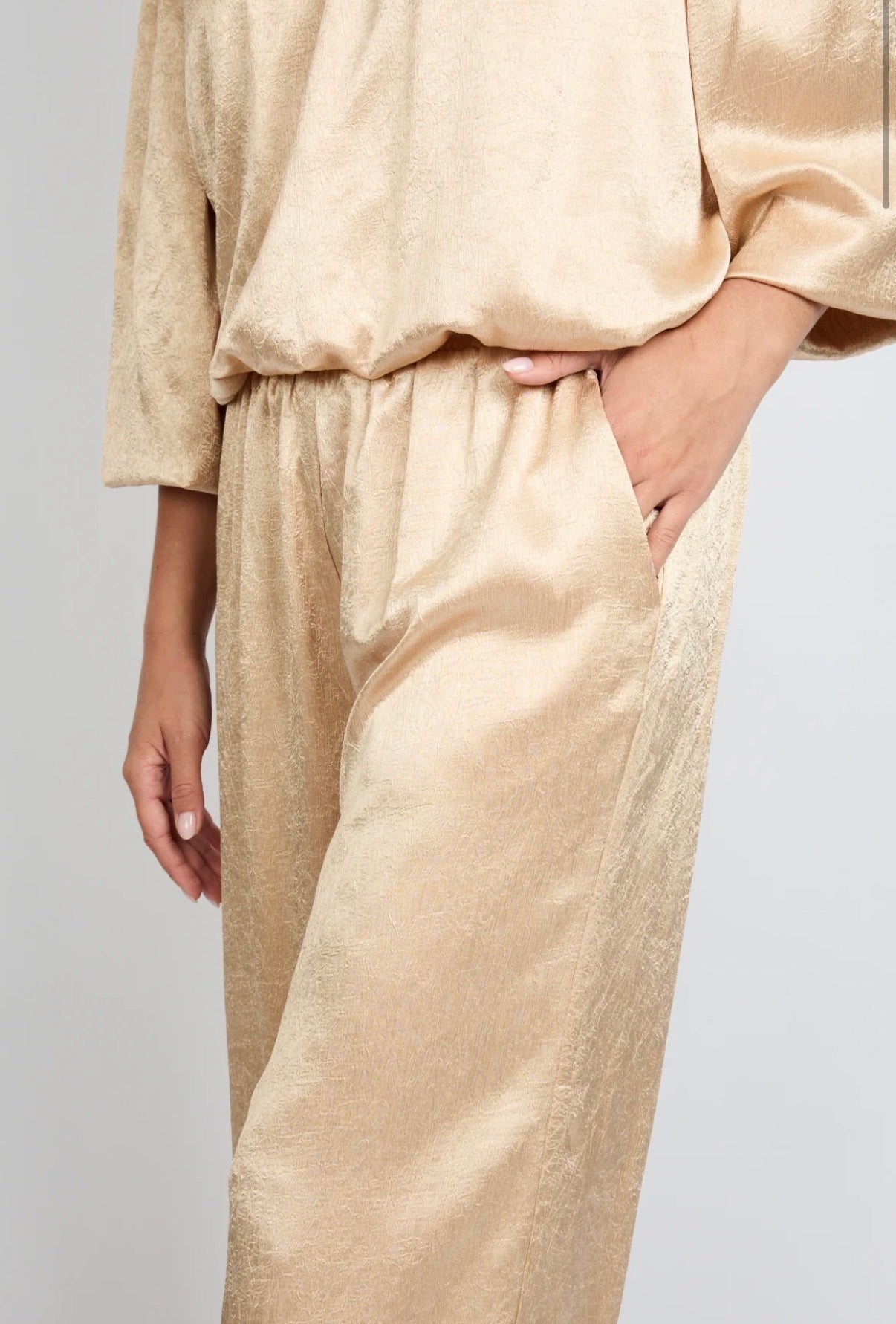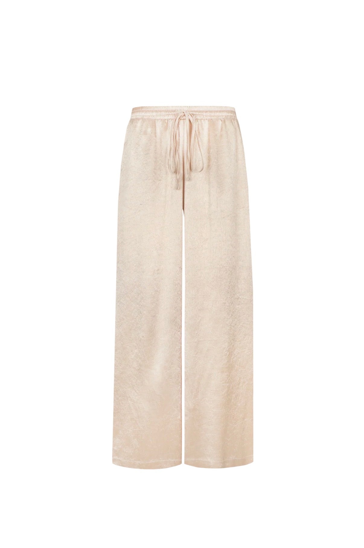 Shine your way through the day. De YOVANKA BROEK heeft een high waist en wijde, soepelvallende pijpen die zorgen voor een elegante en flowy look. De licht glanzende stof geeft direct een luxe uitstraling en beweegt prachtig met je mee. Dankzij de elastische tailleband zit ’ie ook nog eens heerlijk comfortabel. Combineer ’m met de YULIETH TOP voor een golden co ord moment of draag ’m met een basic top voor een subtiele sparkle. Effortless glam, all day long.