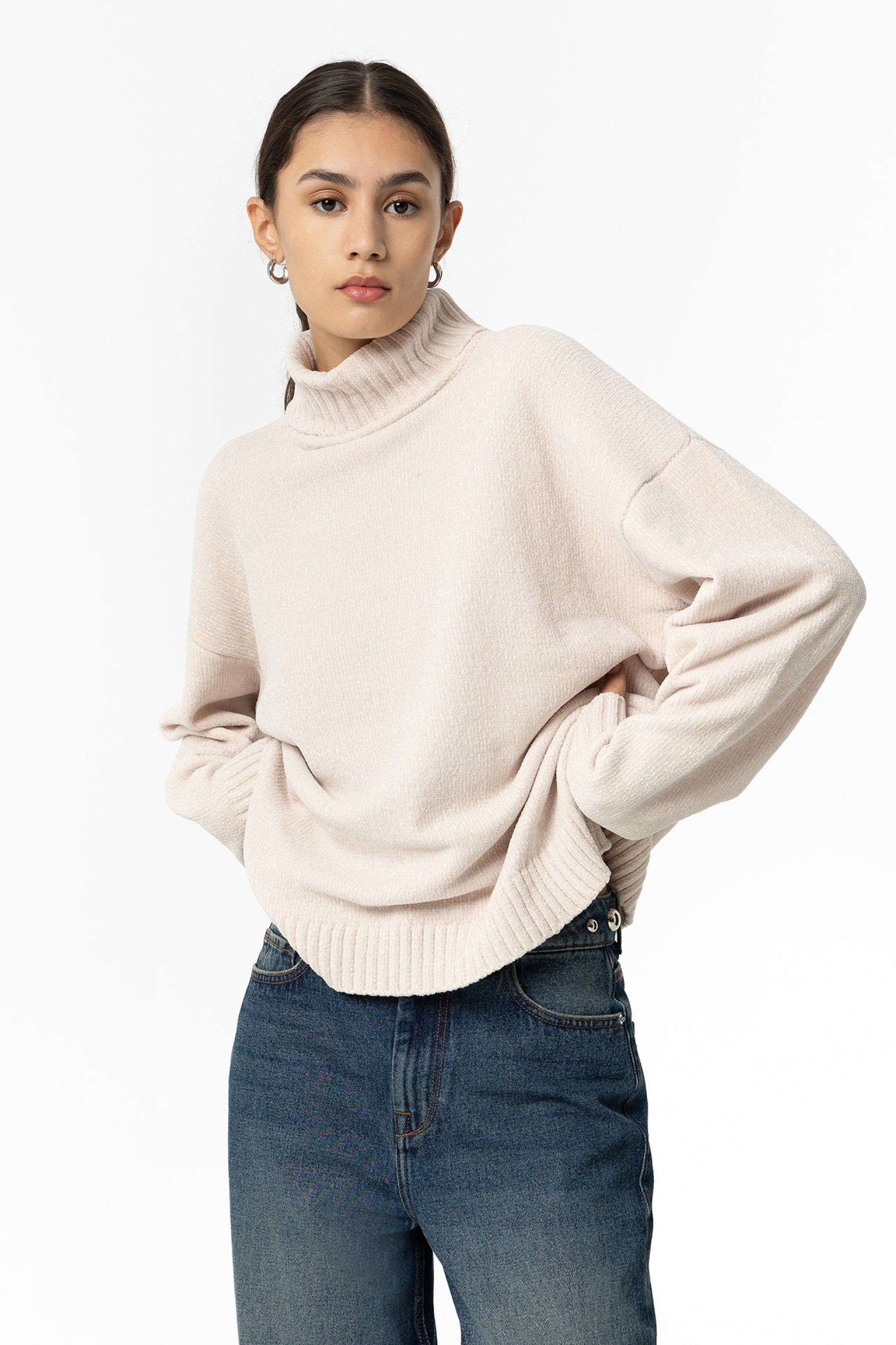 Een zachte en knusse trui die perfect is voor koude dagen. De lange mouwen en hoge kraag zorgen voor extra warmte en comfort. De fluffy textuur geeft een trendy en cosy uitstraling en laat zich makkelijk combineren met jeans, rokken of broeken.