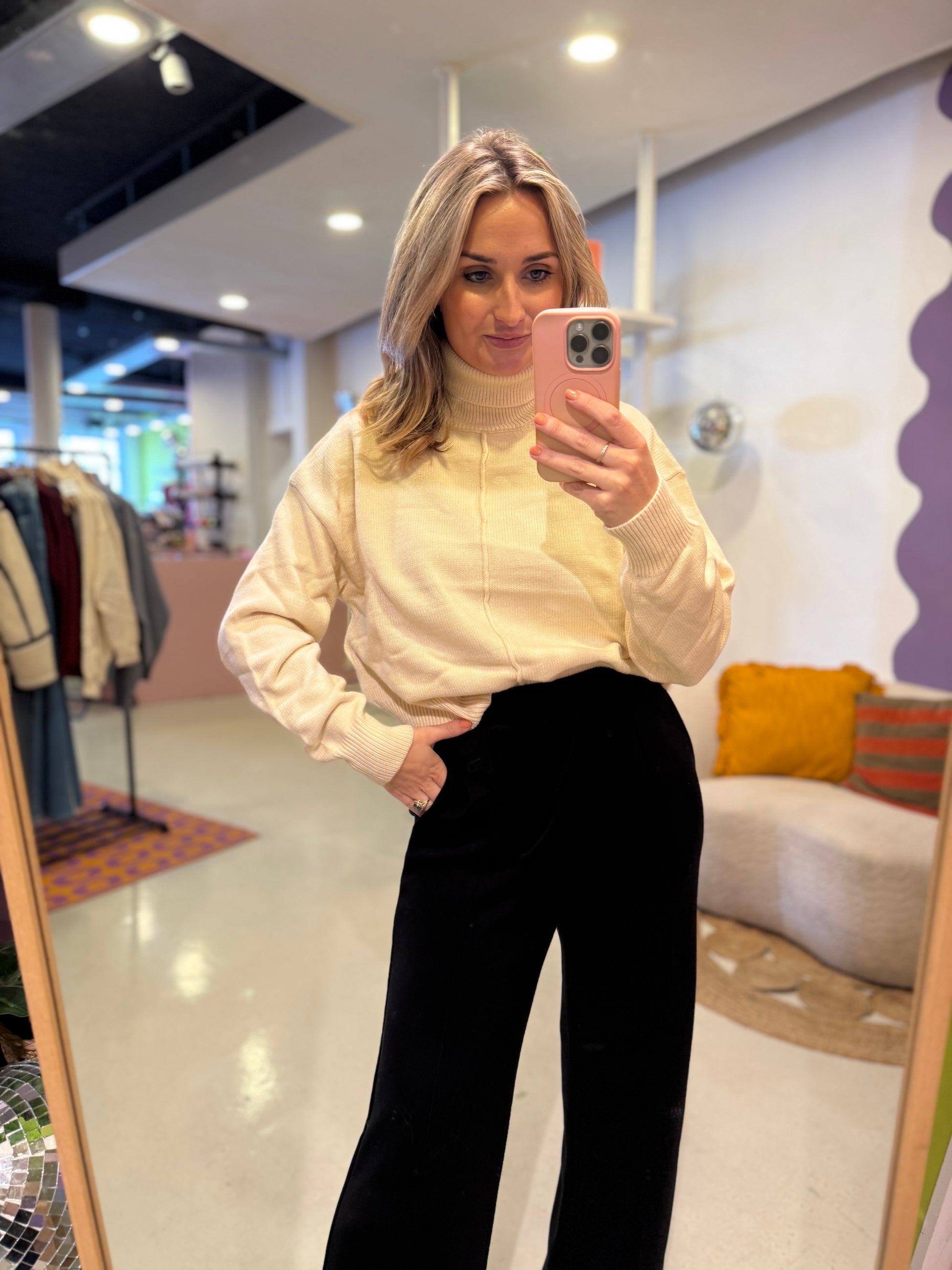 Comfort en stijl komen samen in deze relaxed fit sweater. Het moderne design met een subtiele naad aan de voorkant geeft een minimalistische, maar toch verfijnde look. De hoge hals zorgt voor een elegante uitstraling en extra warmte, terwijl de lange mouwen en ribgebreide afwerking bij boorden en zoom zorgen voor een perfecte pasvorm.