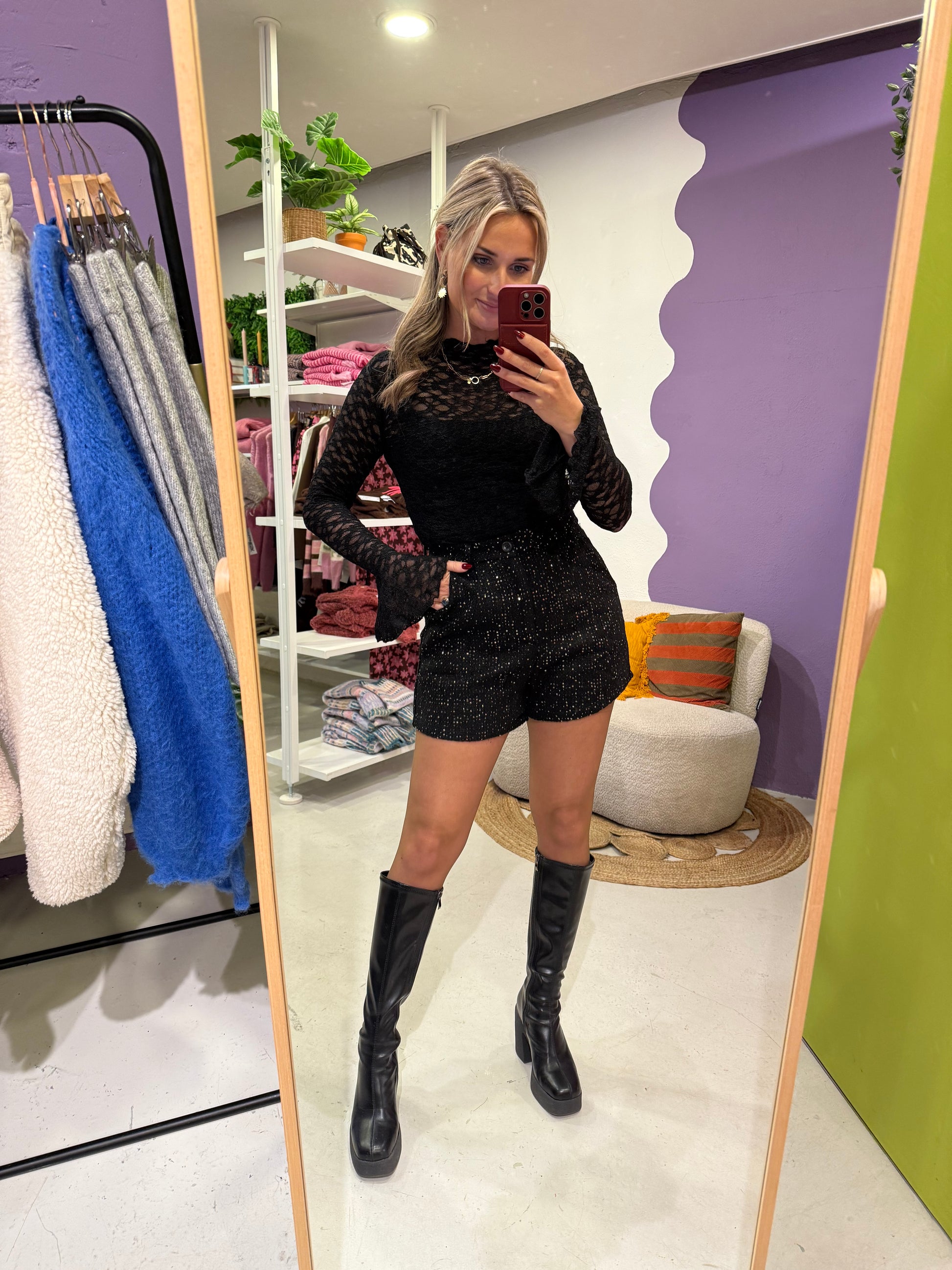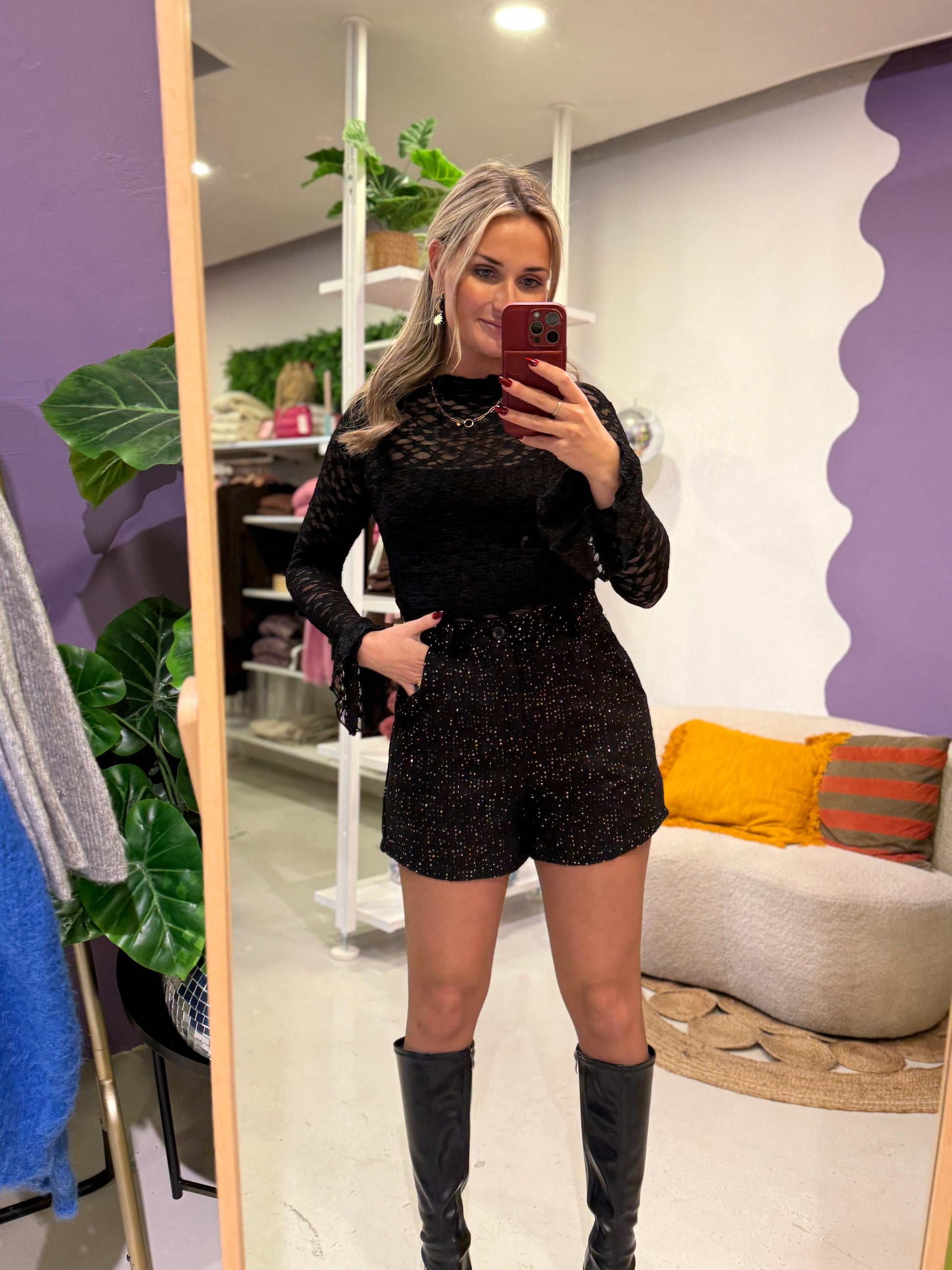 Deze zwarte glitter short is dé musthave voor elke fashionable garderobe. Perfect voor de feestdagen, events of wanneer je gewoon zin hebt in wat extra sparkle! ✨