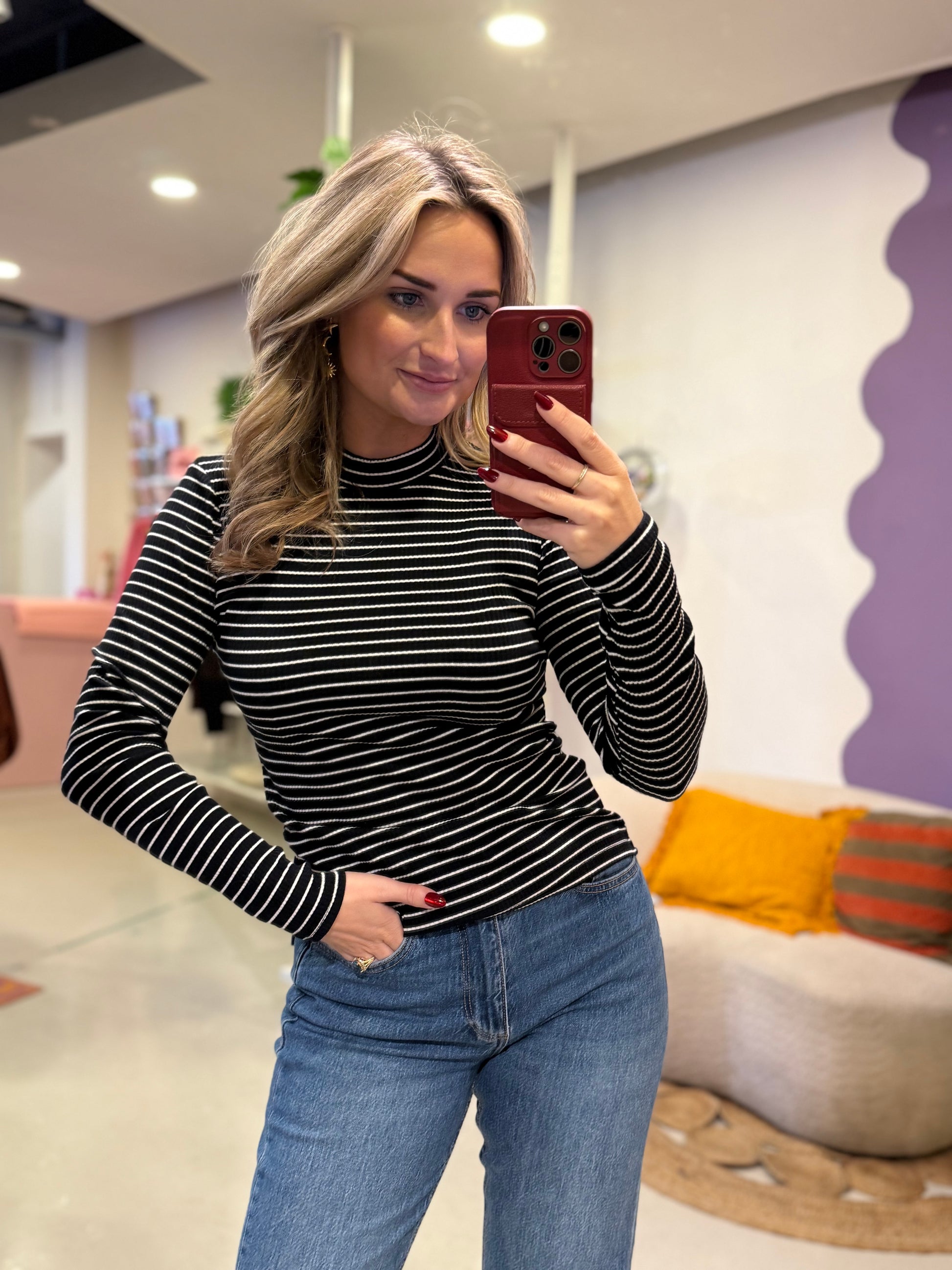 Deze zwart-wit gestreepte top is een echte garderobe klassieker die je eindeloos kunt combineren. De subtiele col en de aangesloten pasvorm geven een moderne, stijlvolle uitstraling. De fijne ribstructuur zorgt voor net dat beetje extra detail én een comfortabele fit.
